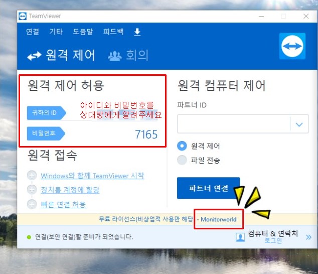 ▲ 원격 제어 허용 '귀하의 ID'와 '비밀번호'를 담당자에게 말씀해 주시면 담당자가 수강생 컴퓨터에 접속